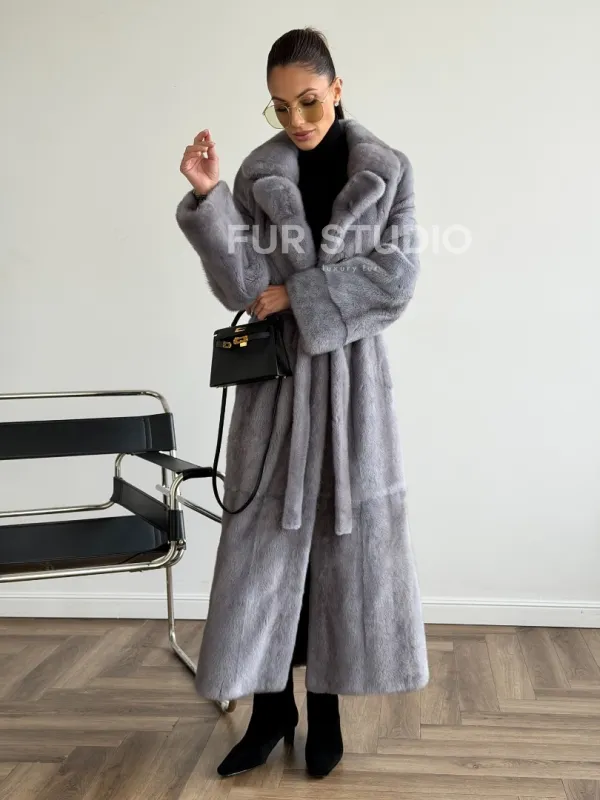 Мех данной шубы аукционная норка, цвет голубой. Предлагается в размерах от 42 до 50. Длина модели 120-125 см, что выгодно подчеркивает фигуру девушек. Эта модель идеально подойдет для девушек и женщин, предпочитающих роскошные натуральные меха.