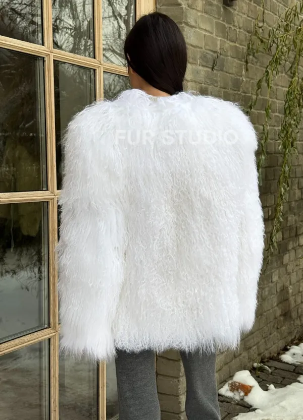 Шуба белая из меха ламы без воротника 101437